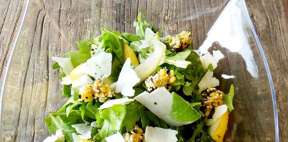 A new twist on an old tradition, this fun salad mixes traditional salad makings with a Mediterranean bar, made with black olives and walnuts.