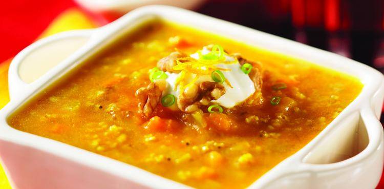 This soup has a mild curry taste enhanced with orange and a hint of sweetness from the maple syrup. Walnuts add a bit of crunch.