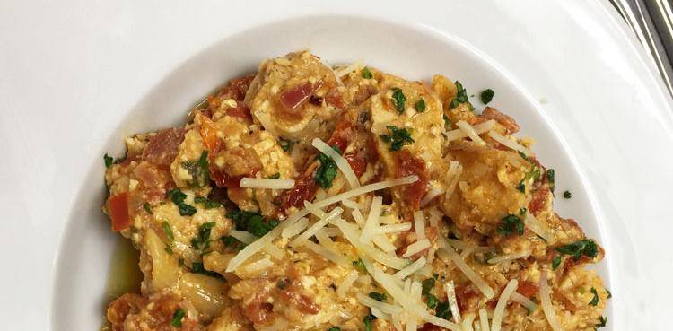 Some store-bought Mediterranean dips have multiple uses, and one is in pasta sauce. This recipe uses a feta-based dip that adds creaminess to an otherwise simple tomato sauce. Use pasta shapes that hold thicker sauce well, such as penne or rotini.