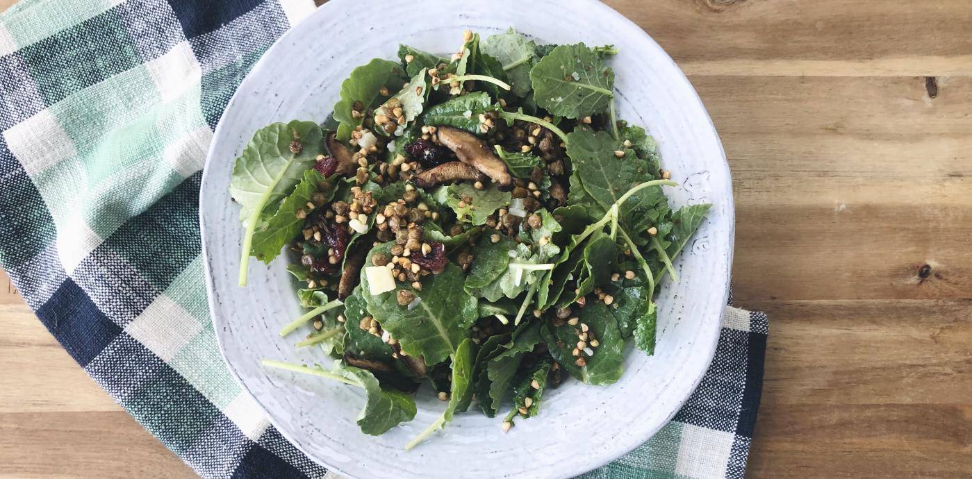 Oven roasting lentils and mushrooms until they get nice and crispy gives this salad a satisfying crunch and a wave of delicious “umami” flavor. The toasted buckwheat acts as the croutons.