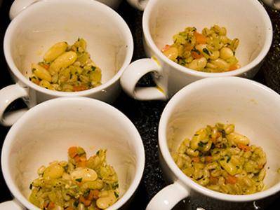 This soup was a big hit at the Whole Grains Council’s 2011 conference in Portland, Oregon. The creative chef there cooked everything together, then separated the broth from the vegetables, beans and farro. We had the fun of adding hot broth to our cup o’ goodies – a great alternative to having lukewarm soup with mushy contents.