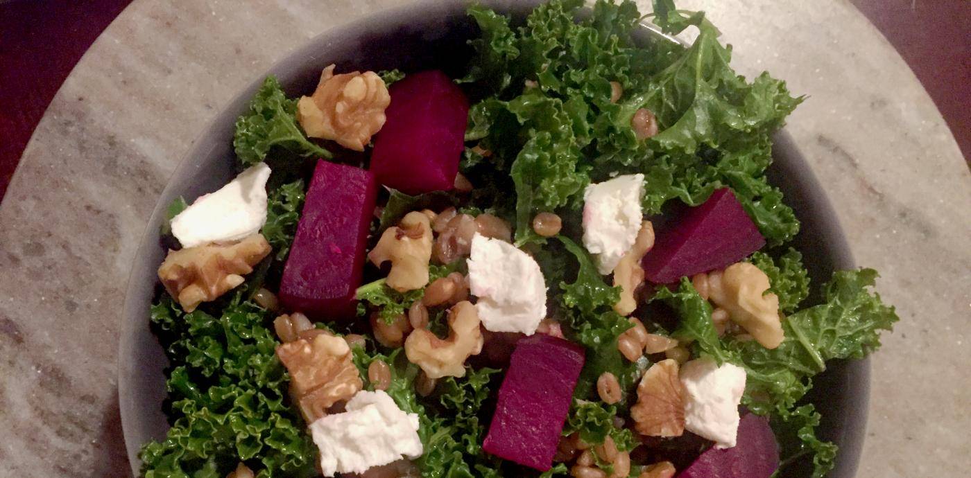 Kale with Roasted Beets, Wheat Berries, Goat Cheese, and Walnuts