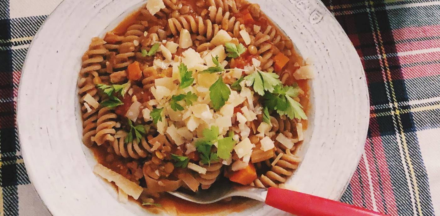 In this recipe, dried lentils are used to stretch a tiny bit of Italian chicken sausage into a hearty, mostly plant-based meal. These rich flavors pair especially well with whole grain pasta.