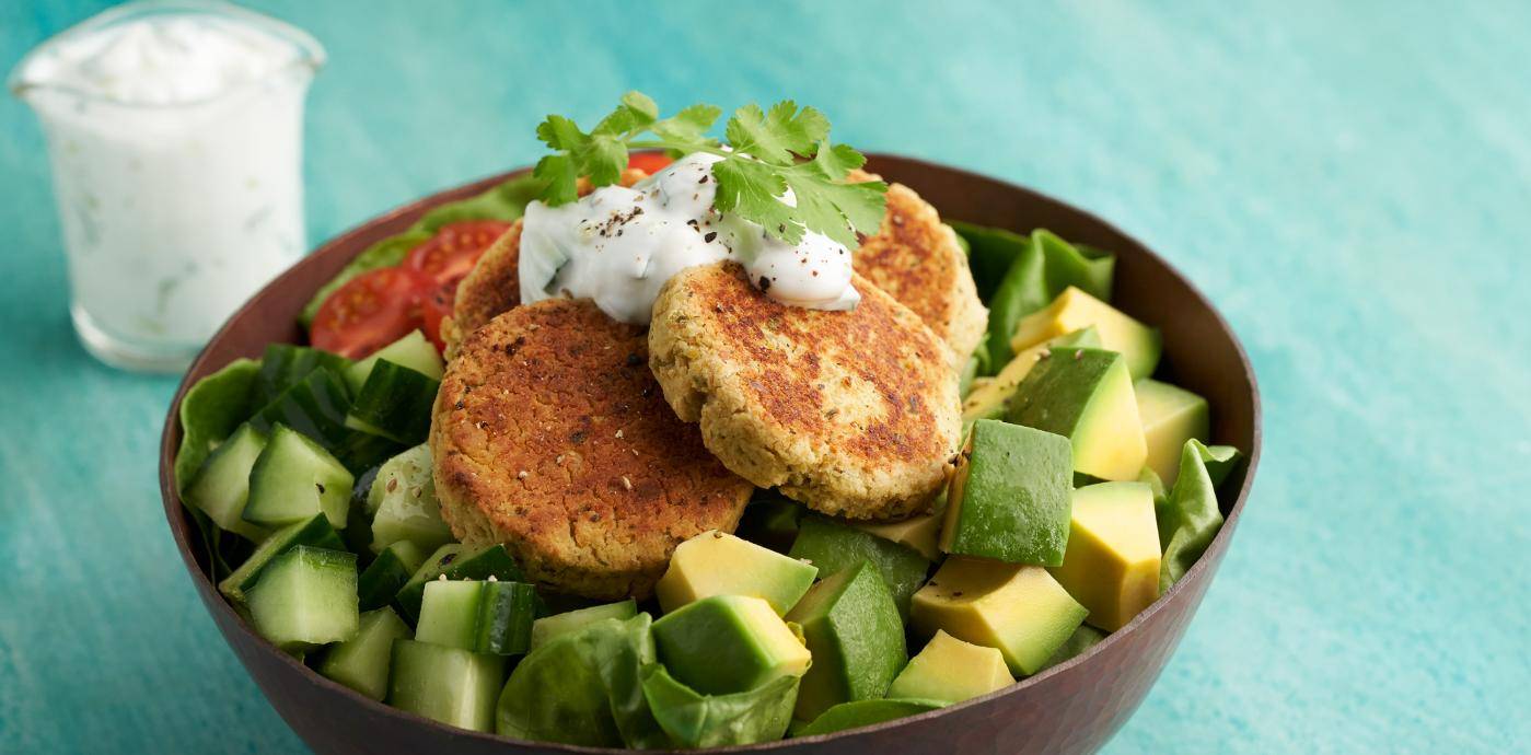This Mediterranean-inspired falafel bowl uses avocados and spicy jalapeño to bring out vibrant flavors. In place of traditional sesame paste, avocados serve as a binder to hold the chickpea batter together, keeping these nut- and seed-free for those with food allergies, while also providing an excellent source of fiber and protein.