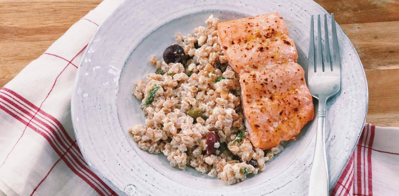 Olives, yogurt, and traditional cheeses are all fermented foods. A buttery fish like salmon is the perfect pair for the tang of this salad.