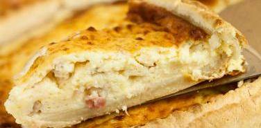 - Distribute the cheese and ham on the pie crust. Pour the egg mixture on top. Bake until the top is browned and the center is set, 30 to 40 minutes. Let cool on a rack for 5 to 10 minutes before slicing into portions.