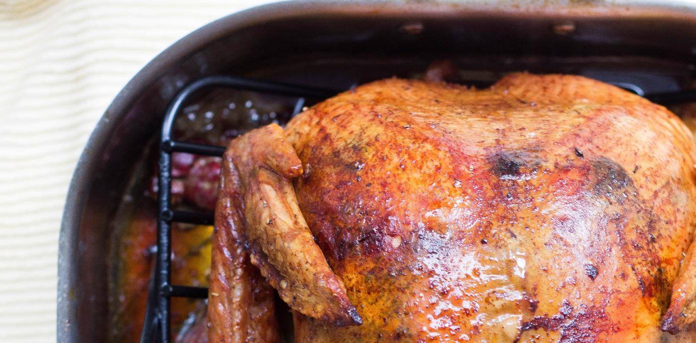 - Roast the chicken, uncovered, for about 1 hour. Ovens and chickens vary quite a bit, so check to make sure the chicken is cooked completely by piercing the skin between the thigh and the leg; if the juice is clear it’s likely done. The chicken should be a very deep golden brown. If you have a meat thermometer, you can remove the chicken from the oven when it reaches 165°F when placed in the thickest part of the thigh.
