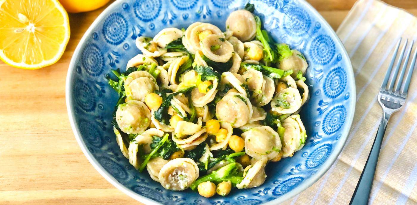 This recipe is from Puglia, the heel of Italy’s boot and the heart of its olive oil production, and is the perfect healthy Mediterranean pasta meal. Delicious al-dente orecchiette pasta is tossed with ample green vegetables, along with chickpeas (for protein), lemon juice (for brightness) and olive oil (for flavor and richness). Feel free to make use of the leftover lemon zest and lemon juice from the Mediterranean Salmon with Olives recipe to cut down on food waste. The broccoli rapini cooks in the same water as the pasta to save water and flavor!