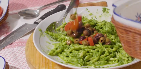 This dish comes from an Italian home cook named Silvana Ghillani, who lives in the Parma province in northern Italy. In this recipe, fresh tomatoes are the key ingredient, mixing with pesto, olives, and Parmigiano-Reggiano to make a flavorful pasta sauce.