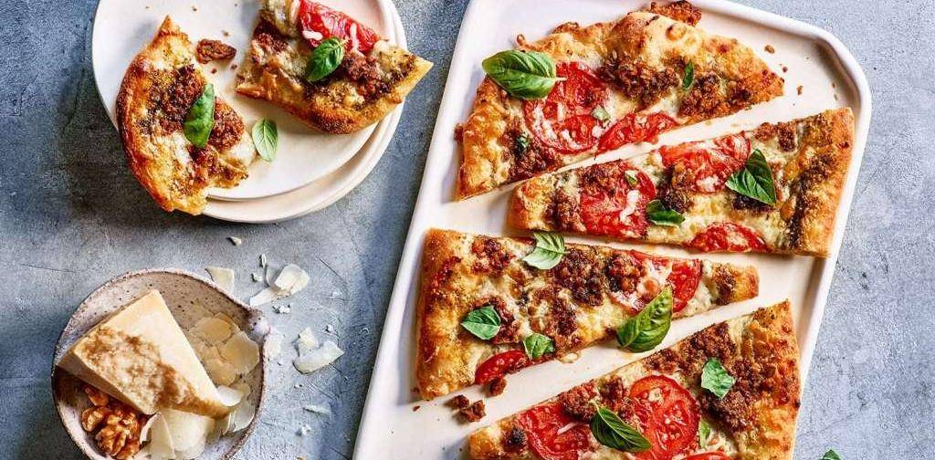 4. Spread the other three doughs with pesto, remaining cheese, remaining sausage crumble, and tomatoes.
