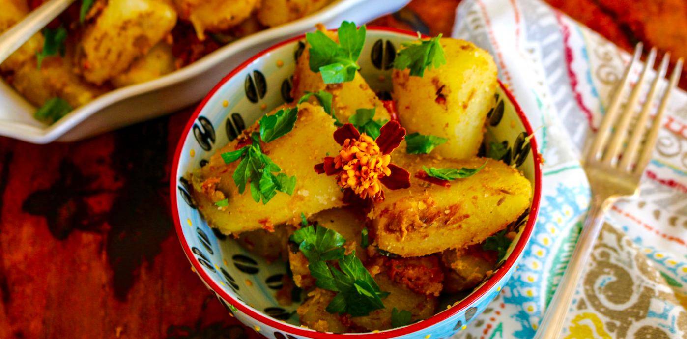 Tender potatoes, pan-cooked with robust spices, is a traditional dish in Indian foodways. Just boil cubed potatoes, then sauté them with onions, garlic, peppers, and spices, and garnish with fresh cilantro. Serve it as a side-dish with simmered lentils. The leftovers are delicious, too!