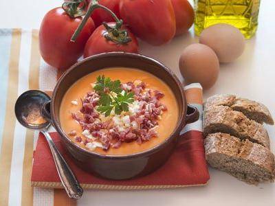 Salmorejo is more filling than gazpacho, with added bread, and extremely tasty thanks to extra virgin olive oil, vinegar, garlic and seasonings. Flavorful seasonal tomatoes help too. Andalusian agricultural laborers made this soup when they worked in vegetables gardens, where all of the ingredients were readily available to them. Leave out the ham to make it vegetarian.