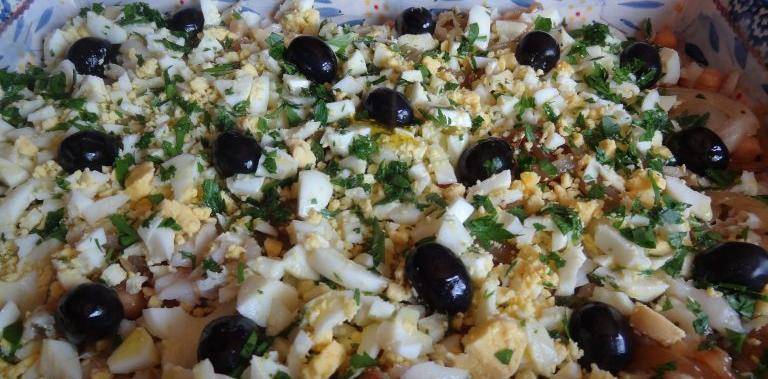 2. On a large serving platter, spread out the chickpeas. Next, layer over the flaked cod, the cooked onion and garlic mixture, and then the chopped hard boiled eggs.