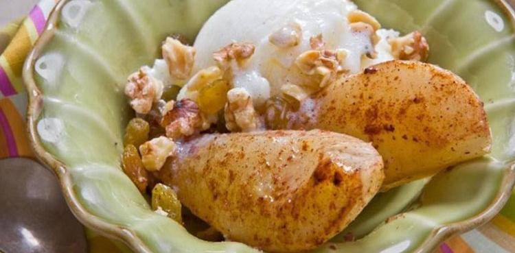 This simple fruit dessert combines sweet pears and crunchy walnuts with cinnamon and spices. The cut pears are visually impressive and they taste great, for minimal effort in the kitchen. Serve it over frozen yogurt or a piece of cheese for a savory twist.