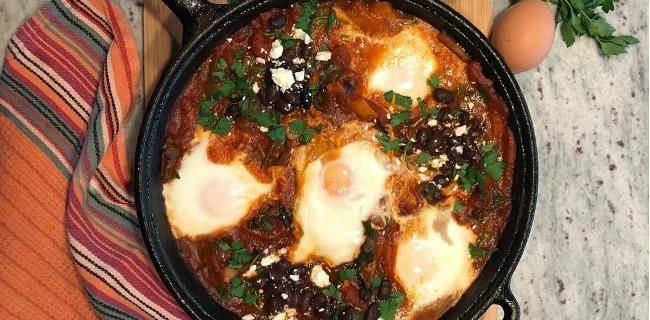 Shakshuka is a traditionally a North African dish, where eggs are cooked in a flavorful tomato sauce and topped with fresh herbs. This version has a Southwestern twist, featuring black beans and fresh cilantro. Try it for breakfast, lunch, or dinner.