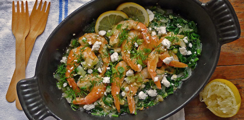 In this twist on saganaki, made with shrimp instead of mussels, the shrimp’s sweetness balances the stew’s lemony broth, herbs, and salty feta cheese.