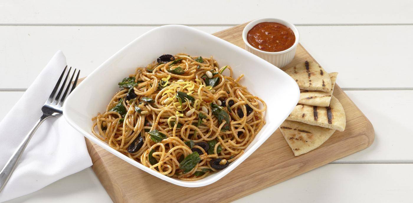Spaghetti gets a North African flavor from spicy harissa paste in this recipe.