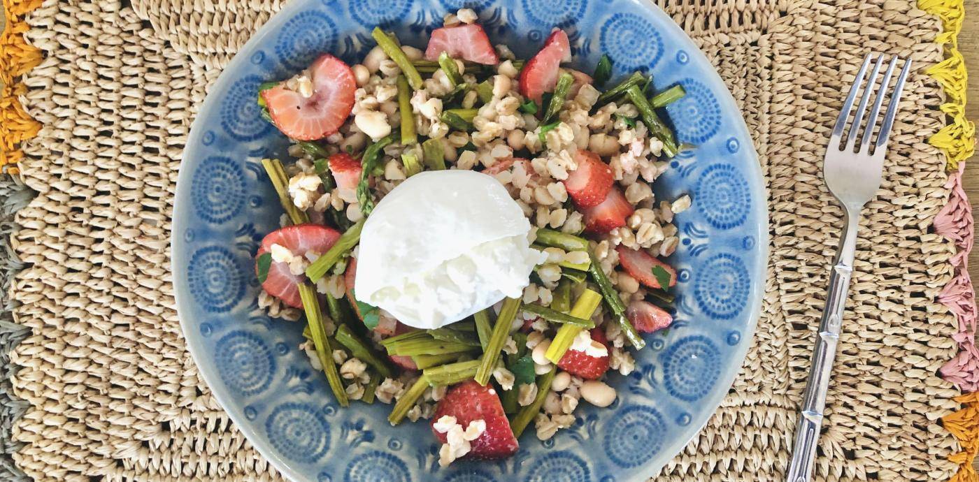 A creamy pillow of burrata is balanced by this plant-forward grain salad featuring springtime favorites like strawberries and asparagus.